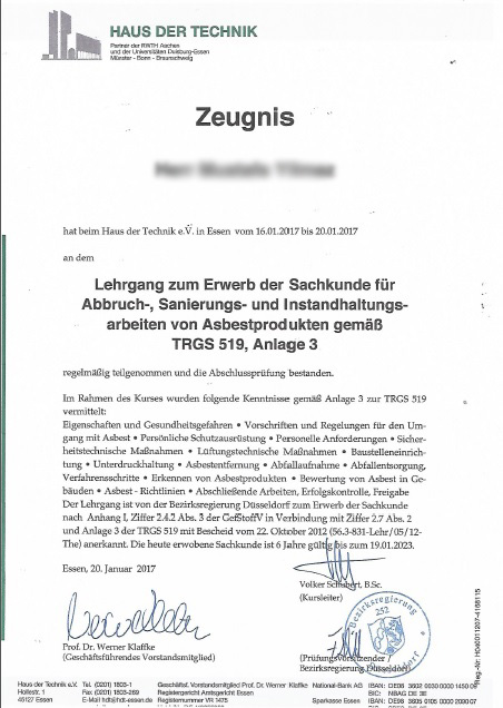 Lehrgang zum Erwerb der Sachkunde für Abbruch-, Sanierungs- und Instandhaltungsarbeiten von Asbestprodukten gem. TRGS 519, Anlage 3