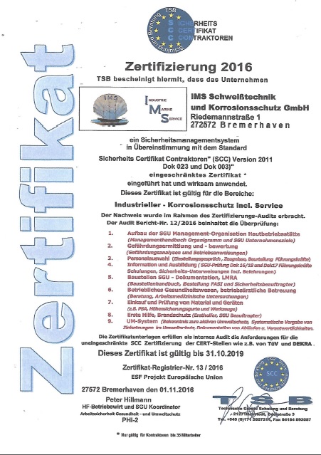 Nachweis über erfolgreich angewandtem Sicherheitsmanagementsystem im Bereich "Industrieller Korrosionsschutz inkl. Service"